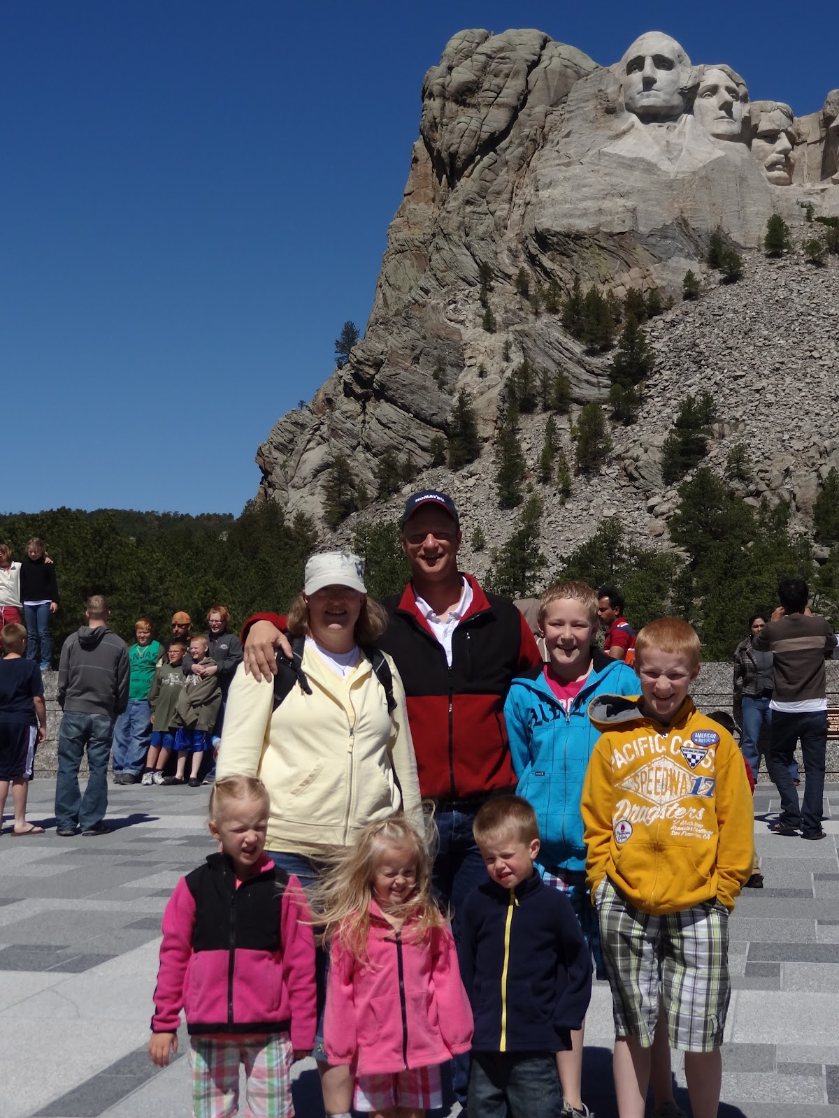 We had pretty gloomy, foggy weather all weekend and we knew Sunday was suppose to be the sunny day of our weekend so we planned to hit Mt. Rushmore then. Well so did everyone else. The line of cars to get into Rushmore that morning went on for miles! The problem with a big group of people and multiple vehicles is that it's too hard to coordinate everyone arriving at the same time. Blair and I and Lyann and Evan's family all made it there within a few minutes of each other. Blair's folks got enough to the top to see the Monument from the road and then turned out of the line and went back down to the town of Keystone to do their own thing. They went and road the 1880's train and the alpine slide. Peter and Wendy's family and my parents all waited in the line of cars for quite awhile and made it there about 30-45 minutes after us. It was a bit windy that morning and slightly cold but atleast it was clear to see the monument. I heard the fog was so dense the past few days it wasn't visible.